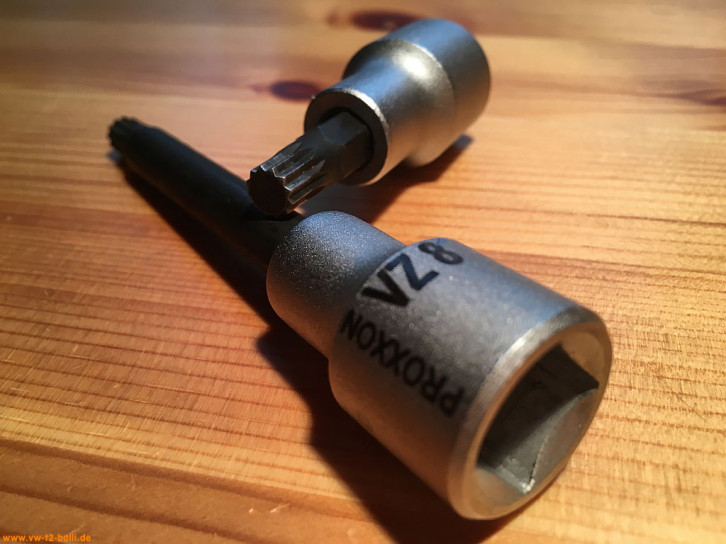 Da die Antriebswellen immer leicht angewinkelt sind und einiges rundherum im Weg ist, habe ich immer zwei Bit/Nuss mit unterschiedlichen Längen dabei: 55mm kurz (PROXXON 23321) und 100mm lang (PROXXON 23371).