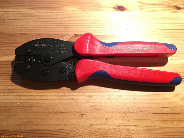 Hochwertige Crimpzange für unisolierte, offene Steckverbinder mit 2,8 und 4,8 mm Steckerbreite und Kabeln von 0,1 - 2,5 mm² wie in luftgekühlten VWs und T2 üblich. Es gibt auch die "97 52 35" für 0,5 - 6 mm², die für manchen vielleicht noch geeigneter ist.