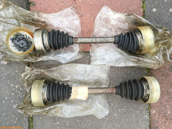 Original VW NOS Antriebswellen für Automatik T2 mit VW Ersatzteilnummer 211 501 203 AX aus den 80ern. Das VW Zeichen und die Teilenummer 211 501 151 B steht auf der Manschette am Rand unter der Metallfassung - und ein rundes Symbol mit Zahl "85". Auf den Manschetten und Achsgelenken steht "Germany".