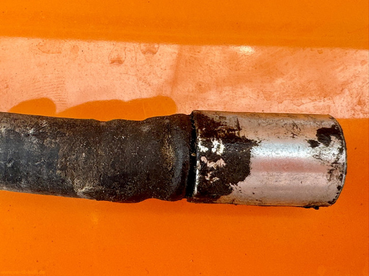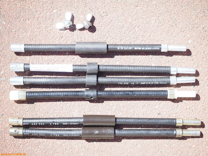 Darunter zwei ca. 353 mm lange Seilführung aus dem aktuellen Zubehörhandel für den T2 von August 1967 bis Juli 1979. Hersteller hier GEMO, Artikelnr. 432 992 4517, "Made in EU by GEMO Germany". Diese passen perfekt und sind ausreichend flexibel. Aber nach 6 Jahren und Wüstenfahrt bei über 43 Grad im Schatten hat sich eine so stark gestaucht, das Schalten immer schwerer wurde und sie ersetzt werden musste.