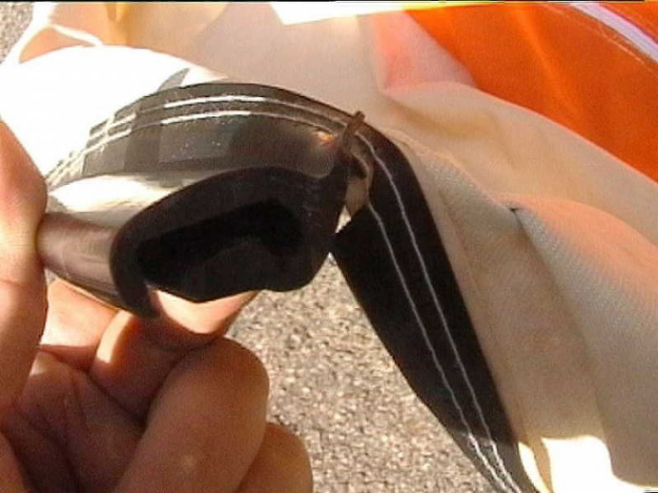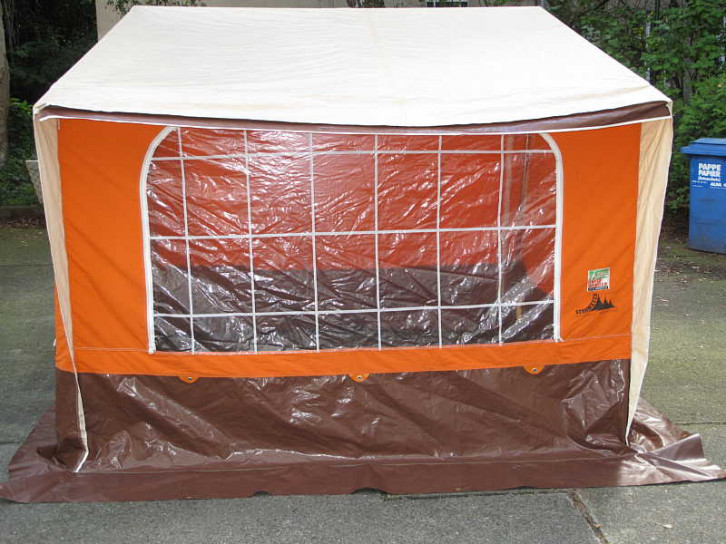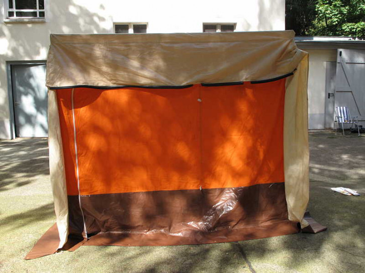 Während der Resto haben wir nach einem Vorzelt in den passenden Farben orange & weiß zum Bulli gesucht. Wir habe dann ein historisch passendes der Firma Fritz Berger, Modell "Rügen" gefunden.