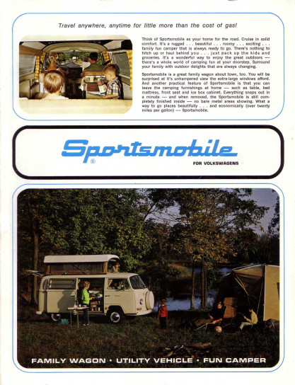 Prospekt mit Beschreibung und Photos der Sportmobile Campmobile Ausstattungen "Model IV", "Model V" und "Clubcar".