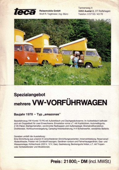 TECA VW T2 Vorführwagen Prospekt mit wenigen Details und Preisen. Genannt wird auch eine Ausstattungsvariante "amazonas".