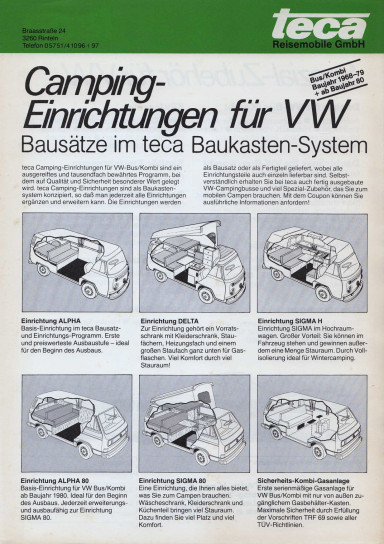 TECA VW T2 Prospekt mit Ausstattungsvarianten "ALPHA", "DELTA", "SIGMA H" - und T3 Einrichtungen.