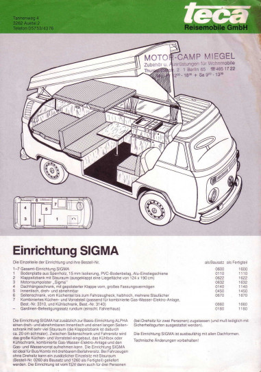 TECA VW T2 Datenblatt der Ausrüstungsvariante SIGMA.