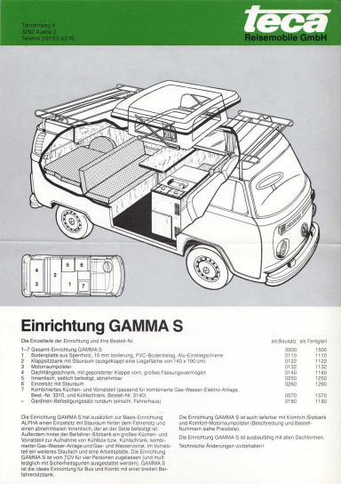 TECA VW T2 Datenblatt der Ausrüstungsvariante GAMMA S.