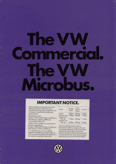 Englisches VW Transporter Prospekt sehr ähnlich der deutschen Fassung mit zusätzlichen Aufkleber für Australien.