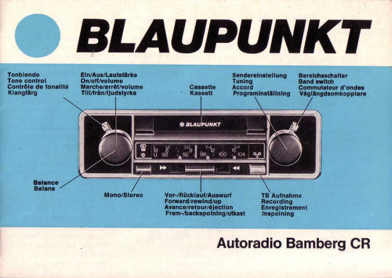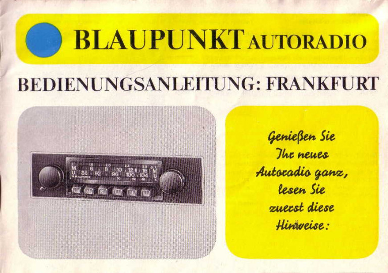 Ganz kurze, mehrsprachige Bedienungsanleitung für Blaupunkt Frankfurt (und Karlsruhe - mit einer UKW Sendertaste weniger) mit Anschlussbeschreibung. Zusätzlicher Schaltplan.