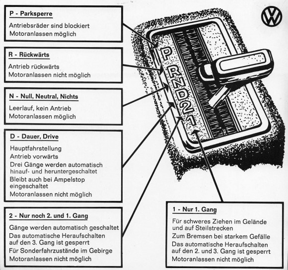 "Im Grunde ist die Bedienung eines Automatik-Fahrzeuges gar kein Problem. Man braucht eigentlich nur drei Wählbereiche: P beim Parken, R beim Rückwärtsfahren und D beim Fahren in allen Situationen, also beim Anfahren, beim Schnellfahren, beim plötzlichen Spurt, wenn man üerholen will, beim Verlangsamen der Fahrt, beim Halt an der Ampel und Fußgängerüberwegen und wieder beim anschließenden Anfahren. Der Wählhebel bleibt auf D stehen. Die Beschleunigung reguliert man mit dem Gaspedal, das Verlangsamen oder Halten mit dem Bremspedal. Einfacher und kreislaufschonender geht es nicht.