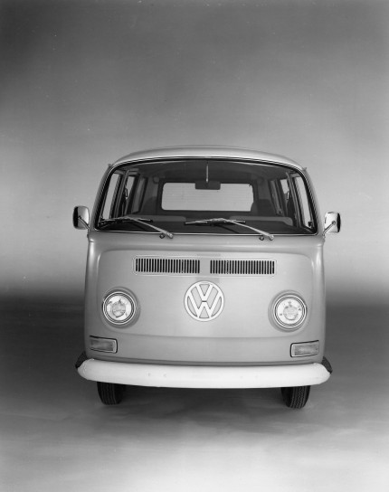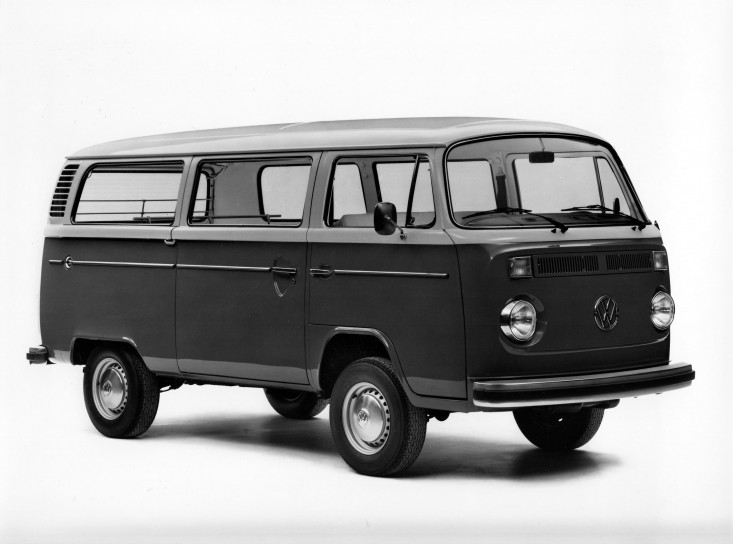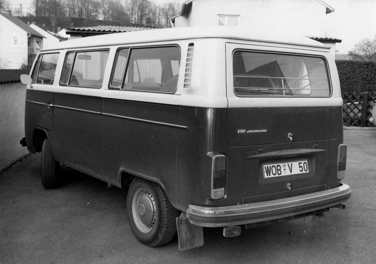 "VW-Bus Jahrgang 1974 mit 1,8 L Heckmotor 68 PS und Vollautomatik. Der 4,5 m lange "Großraum-PKW" kann neun Personen befördern, erreicht eine V-max. von 122 km/h und verbraucht knapp 14 Liter Normalkraftstoff."