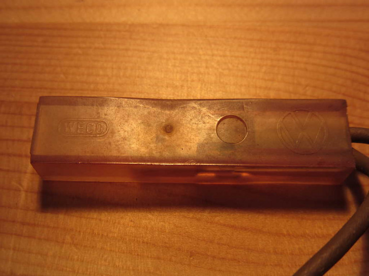 Auf einer der transparenten Kabelhüllen zum Anschluss an die Originalhupe ist neben VW-Zeichen ein Firmzeichen von "Weco" und auf der Rückseite eine "21". Auf einer andern beiliegenden transparenten Kabelhülle ist neben dem VW-Zeichen das HSU Firmenlogo der Firma "Hans Simon in Unkel am Rhein".