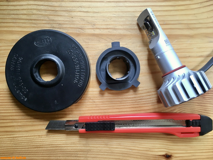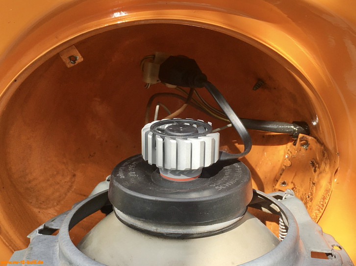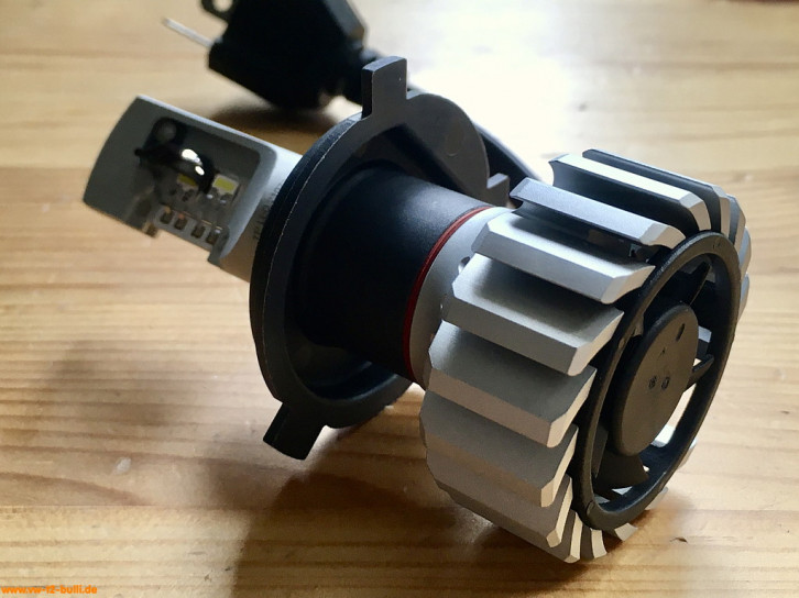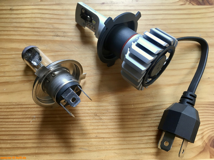 Diese Philips LED H4 Leuchtmittel sind für bestimmten H4 Scheinwerfern für den T2 zulässig geprüft (HELLA mit Scheinwerferprüfnummer E1 14551 oder 14565). Sie bieten mehr Licht, dieses in 5800 Kelvin Tageslichtweiß, bei deutlich geringeren Verbrauch - kosten aber auch einiges mehr als H4 Glühfadenlampen. Gegenüber der OSRAM Version lässt sich hier der Ring noch einfacher abnehmen um ihn durch die rund aufzuschneidene Gummikappe durchzustecken. Wie bei Osram sitzt der Stecker danach nicht mehr direkt hinter dem Leuchtmittel, sondern an einem extra Kabeladapter. Hinter dem Leuchtmittel ist zur Kühlung ein Lüfter angebracht, der nicht immer läuft und auch dann nur im Stand zu hören ist.