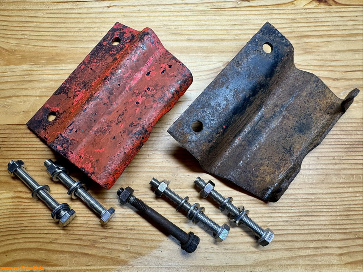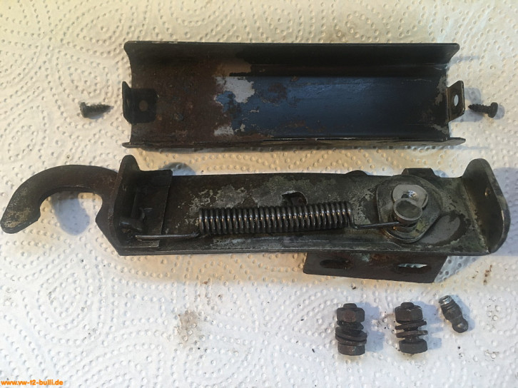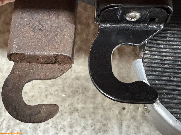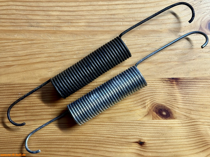 Rückzugsfederhalter zu montieren mit M6 Schrauben am Längsträger für die Rückzugsfeder (VW# 271 821 891) und mit Gummipuffer (VW# 211 843 749) als Anschlag für den ausgefahren Zustand der Trittstufe. In Bilden alte gebrauchte und neue Feder.