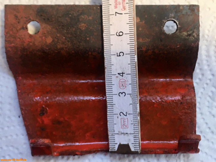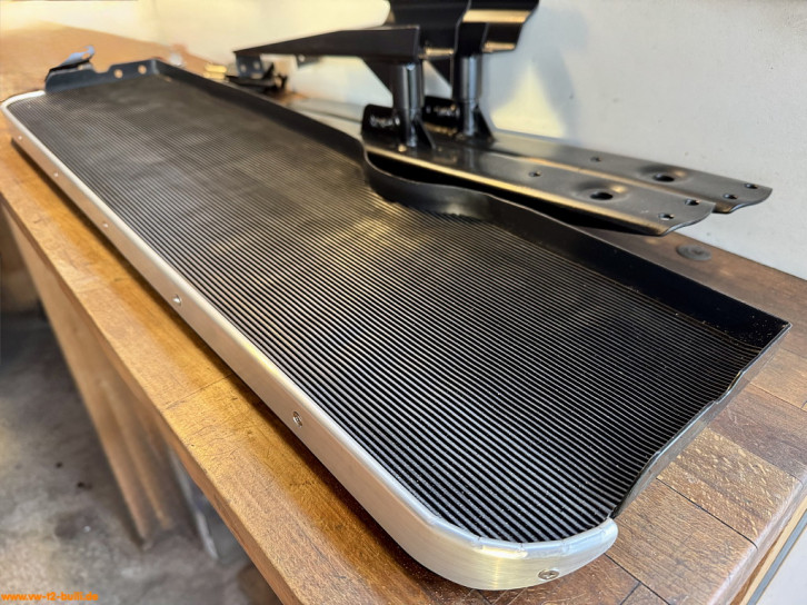 Auf der Suche nach Anbauteilen habe ich auch noch ein zweite unvollständige Trittstufe erhalten, die in den Ausmaßen kleiner ist - beide sind 76,5 cm lang, aber die mit T2b Halterungen war 19 cm tief, die andere nur 16 cm - möglicherweise unterschiedliche Größen über die Jahre für den T2 - oder gar noch T1 mit Schiebetüren ab 1963... Der Haken am Fangarm daran hat aber die Form des Reparaturleitfaden "Aufbau" von 1969 und nicht des hier sonst gezeigten vom T2b. Das Rätsel ist noch zu lösen. Auch für T3 ist 76,5 cm lang und 19 cm tief. Untererschiedlichen Varianten oder genaue Ausmaße sind nicht durch VW belegt.