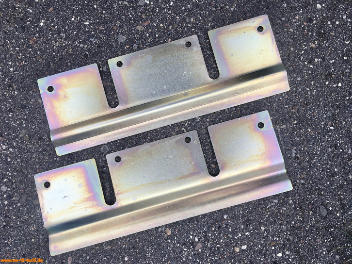 An einem der Halter ein Gummipuffer (VW# 211 841 691 A) mit eingegossener M5 Schraube und M5 Mutter als Anschlag für den eingefahrenen Zustand.