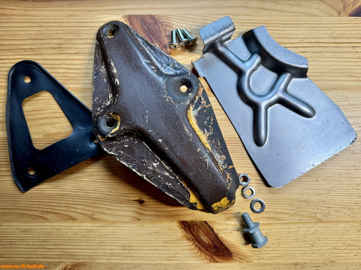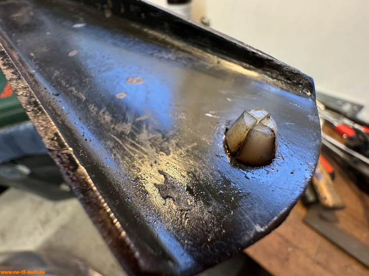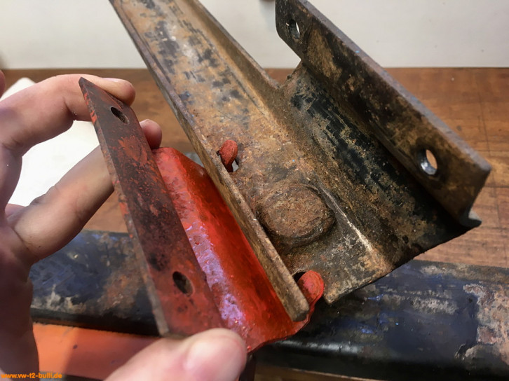 Weil am späten T2 im Längsträger dort innen ein Verstärkungsblech im Weg ist für Schrauben, war meiner wohl vorher einfach festgeschweißt statt angeschraubt - und dann aus dem Träger ausgeschnitten. Ich suche derzeit noch nach einer Lösung mit anderen Anschraubpunkten und verlängertem Bauteil - oder schweiße es acuh einfach an.