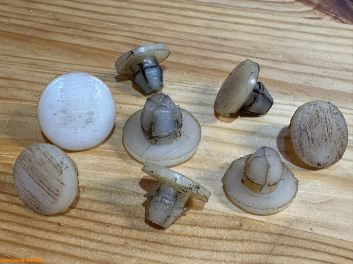 Im ausgefahrem Zustand Nylon Gleitern je Halter 3x für Trittstufe (VW# 271 821 890, Clip, 16 x 16 x 12 mm) und je 1x unter dem Längsträger (VW# ???, 20 x 20 x 14 mm).