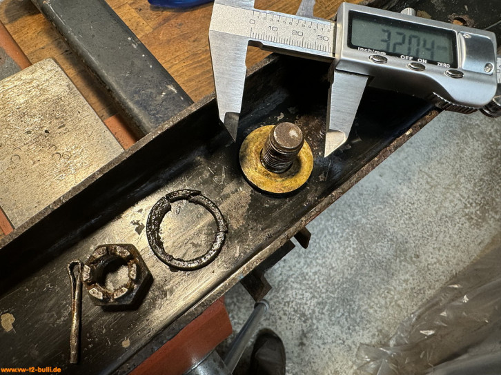 Der unten angebrachte Mitnehmerzapfen (VW# 271 843 857) nutzt ein M8 Gewinde, befestigt mit Unterlegscheibe (VW# N 011 525 20, 8,4 x 16 x 1,6 mm), Federring (N 012 038 7, für 8 mm) und Sechskantmutter (VW# N 011 008 8, M8).