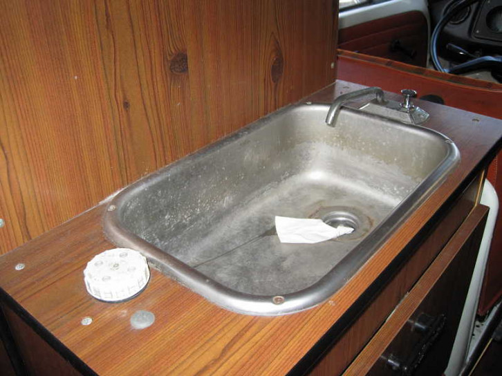 Im Schrank hinter dem Fahrer befindet sich eine kleine Spüle mit E-Pumpe und Wassertank darunter und ganz unten einem weiteren Staufach.