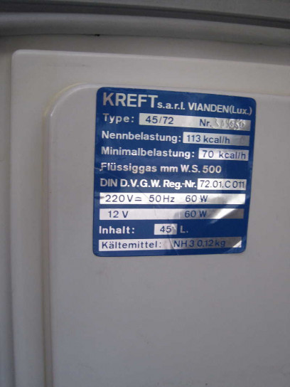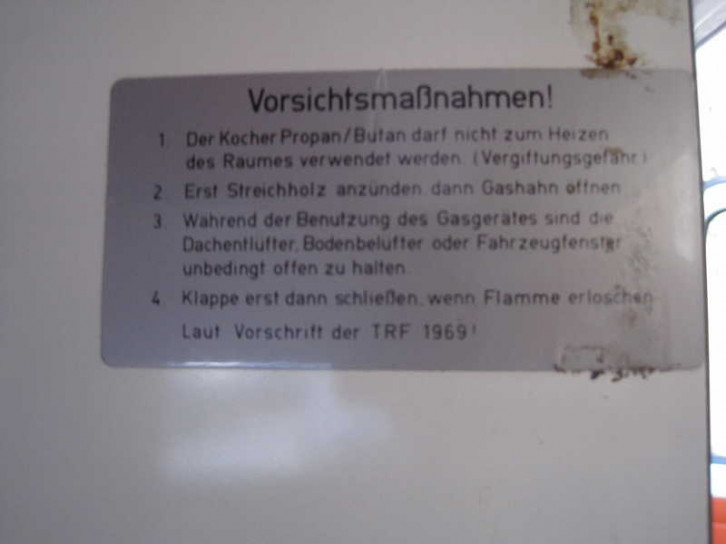 Im Küchenteil an der Schiebetür findet sich ein Kühlschrank und oben eine Gasherd. Der Kühlschrank hat für den Gasbetrieb eine Abluftrohr zur B-Säule auf der Fahrerseite. Die Klappe auf dem Gasherd wird etwas angehoben, leicht zur Fahrzeugmitte geschoben, aufgeklappt und wieder zur Fahrzeugaussenseite geschoben.