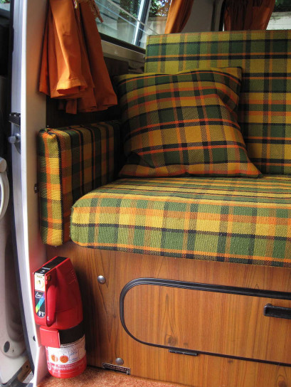 Die Inneneinrichtung hat eine gut gemachte Holzoptik, ist aber nur Resopal (Hochdruckschichtpressstoffplatten). Dafür ist diese Holzimitation sehr viel robuster und pflegeleichter als Echtholzeinrichtung vergleichbarer Wohnmobile und Wohnwagen. Die ersten Westfalia-Varianten setzten noch auf helles "Birken"-Holzfurnier-Imitation - ab Modelljahr 1972 wurde auf dunkleres "Fichten"-Furnier-Imitation umgestellt (wobei es gegenüber Fichtenholz doch eher recht dunkel und rötlich nach Teak aussieht).