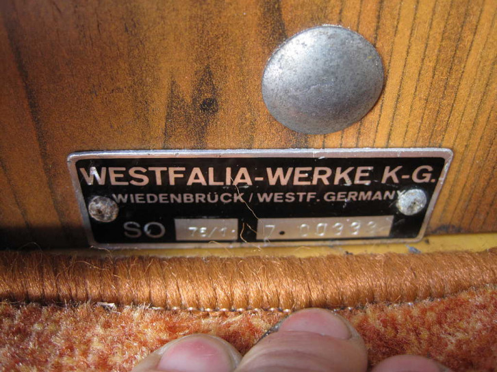 Westfalia hat an seine Ausstattungen sichtbare Typenschilder verbaut, die heute zur Einordnung einer Ausstattung helfen können. Sie wurden z.B. bei der Berlin Ausstattung an der Sitzbank auf der Beifahrerseite nahe dem Boden angebracht.