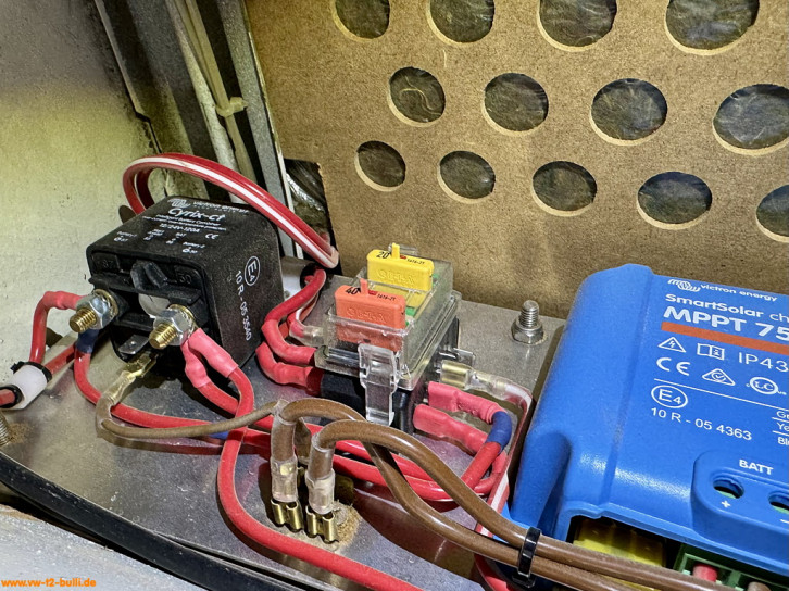 Eingebaut ist es bei mit mit Batteriekoppler-Relais und Sicherungen im Motorraum auf der Fahrerseite neben dem Tankschott. Der mit Spannungswächter ausgestattete Plus Lastausgang geht dann per Kabel hoch in den Kleiderschrank und von dort in meine Elektiktechnikecke in das Staufach hinter der Kühlbox der Westfalia "Berlin" Ausstattung. Von dort dann Weiterverteilt an Verbraucher und 12 V und USB Steckdosen.