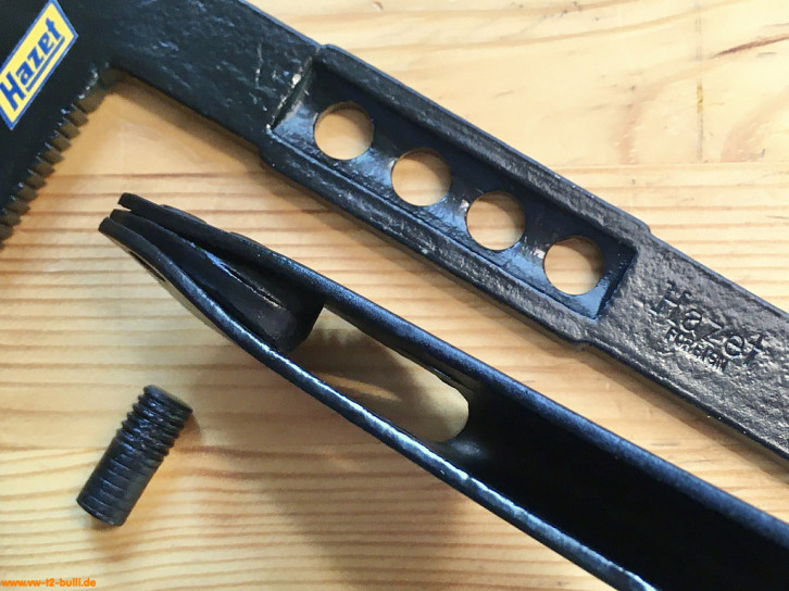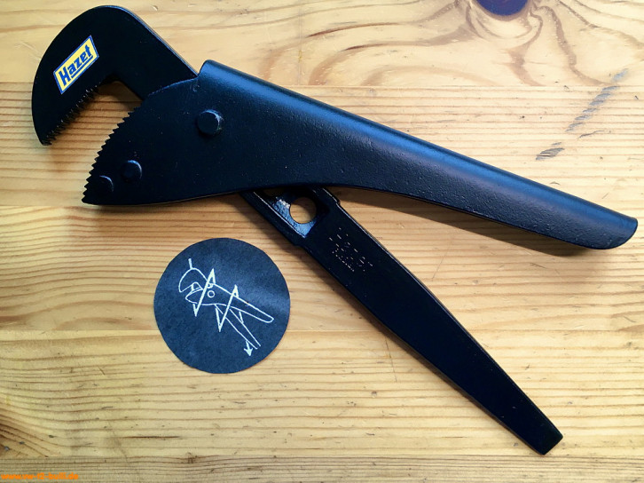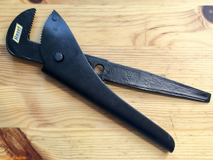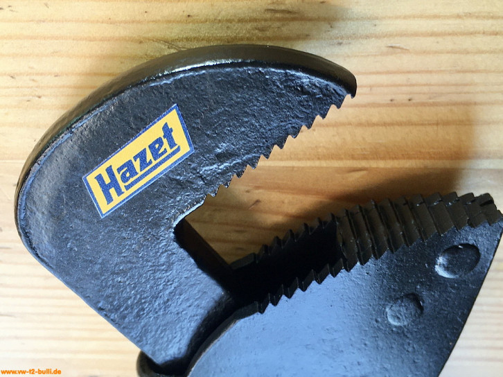 Randbemerkung: Rohrzangen in diesem einfachen Design sieht man häufiger ob von Hazet als "No. 140" aus frühen Zeiten bis 1930 wie diese, oder als "No. 155" von Meister & Schlingensiepen aus Wuppertal um 1928 mit Clyburn-Rollgabelschlüssel-Kopf Firmenlogo, oder von GEDORE (GEbrüderDOwidatREmscheid) oder dann DOWIDAT nach dem 2. Weltkrieg mit eingeprägter Zoll-Größe in Kreis und teils mit Firmenname, bis hin in die 1970er als "699" von Footprint Tools Fußabdruck als Logo (England, Sheffield, gegründet als Alfrid Ridge & Sons um 1760). Sie kamen mit der Industrialisierung und zunehmenden Installationen von Gas und Wasser in Haushalten und Betrieben auf, weniger als Werkzeuge für Automobile.