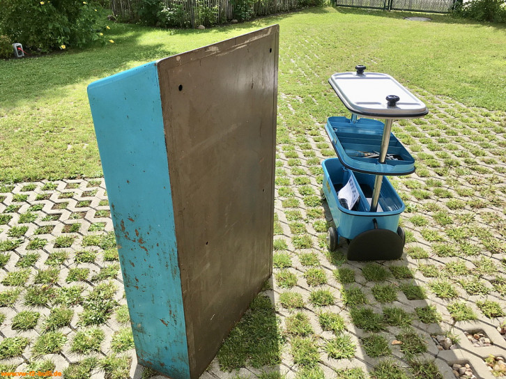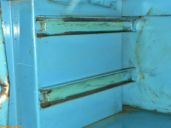 Der Werkzeugschrank ist hellblau lackiert auch innen und unten - nur die Rückwand ist grau.