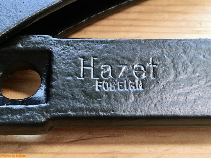 Aufschriften sind auf der einen Seite "Hazet" und klein darunter "FOREIGN" für den Export (eigentlich abwertend gedacht und notwendig für Großbritannien durch den "Merchandise Marks Act" von 1887 bis 1926, aus dem dann eher das Gegenteil als fast schon Gütesiegel "Made in Germany" entstand).