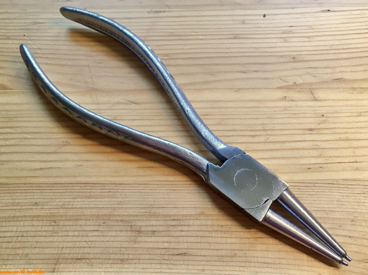 Diese ca. 170 mm lange gerade Zange nach DIN 5256 für Sicherungsringe (Innensicherungen, nach DIN 984 von 19 bis 60 mm) war Teil von Werkzeugschränken.