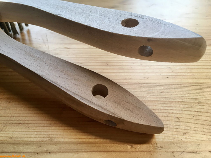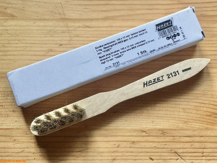 Einfache Zündkerzenbürste aus Holz mit gewellten Messing-Drahtborsten und einer Gesamtlänge von 150 mm, 3-reihig mit 15 mm Länge. Sie war Teil der frühen HAZET Werkstattausrüstung für luftgekühlte VWs bis ca. 1965 und Teil aller kleinen Werkzeugschränke 110 noch bis 1979.