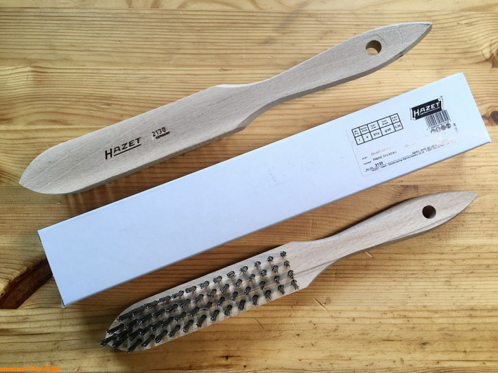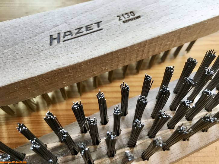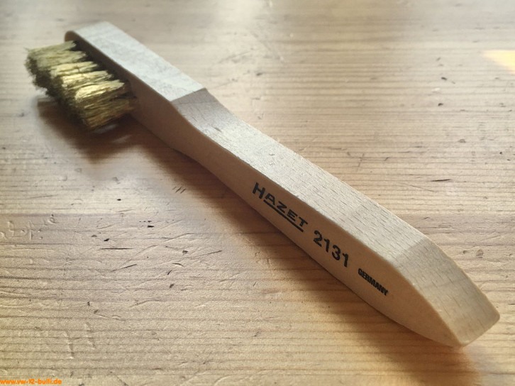 Einfache Drahtbürste aus Holz mit einer Gesamtlänge von 290 mm, 4-reihig mit 25 mm Länge, war Teil der HAZET Werkstattausrüstung für luftgekühlte VWs.