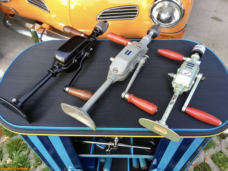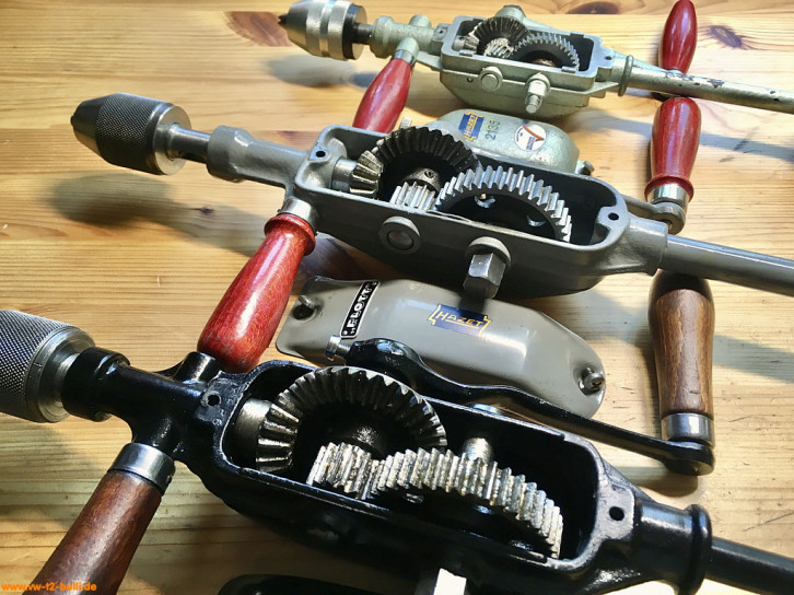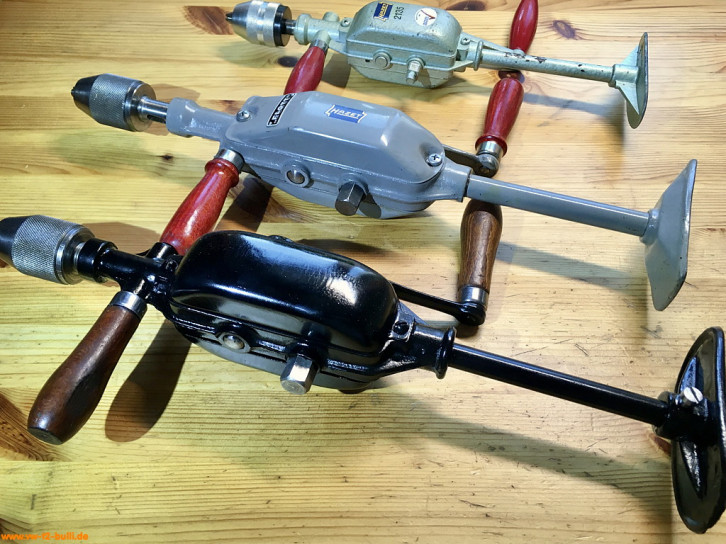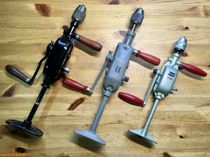 Diese 420/440/340 mm langen und 2300/2240/1290 g schwere Handbohrmaschinen bis 13 mm waren Teil von Werkzeugschränken. Der Kurbelgriff kann an zwei Stellen des Getriebes befestigt werden für zwei unterschiedliche Geschwindigkeiten. Der zweite, fixe Griff kann von einer Seite zur anderen getauscht werden.
