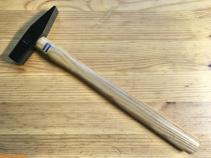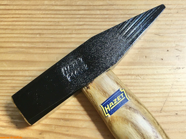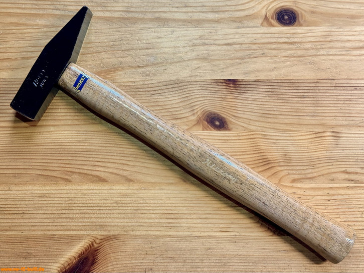 Dieser 315 mm lange und 300 g schwere Schlosserhammer mit Holzgriff aus Hickory (sehr hartes, belastbares und haltbares Holz aus Walnussgewächs) war Teil von HAZET Werkzeugschränken.