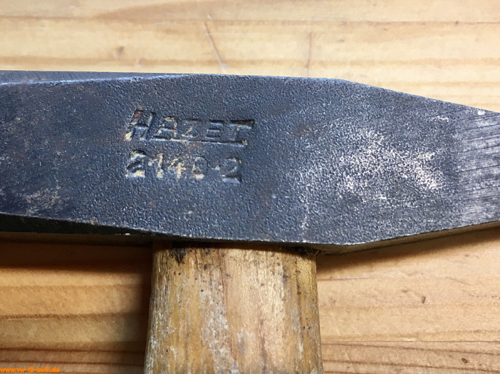 Zwar gab es schon früh ab 1949 in Sortimenten auch einen 300 g Schlosserhammer oder als "120" 1938 ein 400 g Hammer, aber sonst nicht einzeln von Hazet. Die hier gezeigte Version gab es ab ca. 1958 bis vor 1985. Um 1985 gab es oben um den Stiel eine Stielschutzhülse, um 1992 wieder zu verschwinden und schwarz aufgedruckte Bezeichnungen auf dem Stiel, um 2000 wieder geändert mit "HICKORY" in Großschreibung Schriftzug ohne Serifen und später als "2140-20" um 2020 zweifarbigen look in blau ("BluGuard") und schwarz. Diese Version ist nach 1965 wegen der Großschreibung der Marke und möglicherweise vor 1985. Aber eher vor 1969, da die alte Firma CADOS "Carl Döhl Söhne" aus Wuppertal-Ronsdorf