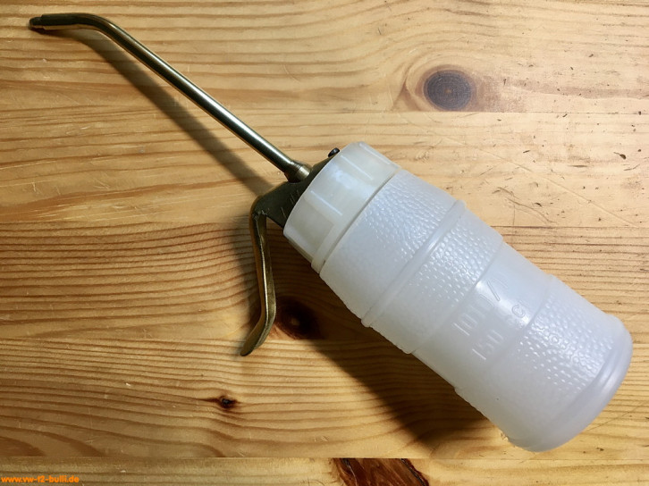 Randbemerkung: dieses und andere Ölspritzkännchen sind von HAZET zugekauft und stammen mindestens ab 1958 von der Firma Pressol (gegründet um 1914 von Jakob Preßl). Ähnliche Pressol Spezial Öler in Größe 2 werden auch heute noch gebaut, aber ohne Messing, mit einfacher geformten Dosierhebel und mit Kunststoffdeckel.
