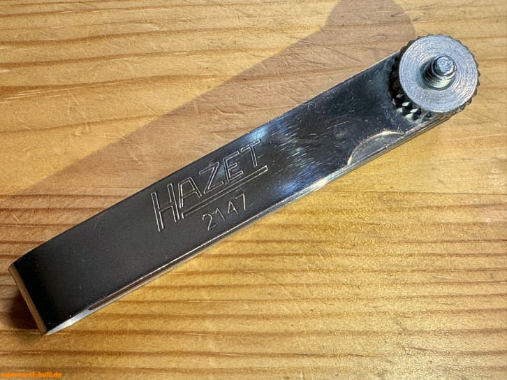 Aufschriften ist "HAZET 2147" auf dem Griff - und die Größen "0,05 mm" um 0,05 mm steigend bis "1,00 mm" auf den Fühlerlehrenblätter.