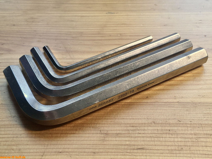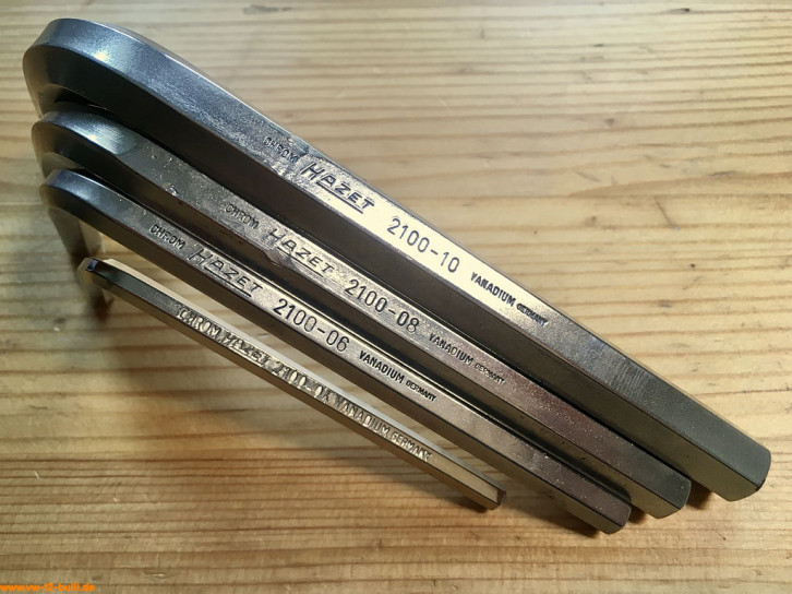 Diese Winkelschraubendreher DIN 911 für Innensechskantschrauben (bei uns auch geläufig unter dem Namen Inbus für "INnensechskant Bauer Und Schaurte") in den Größen 4, 6, 8 und 10 mm sind Teil der HAZET Werkstattausrüstung für luftgekühlte VWs.