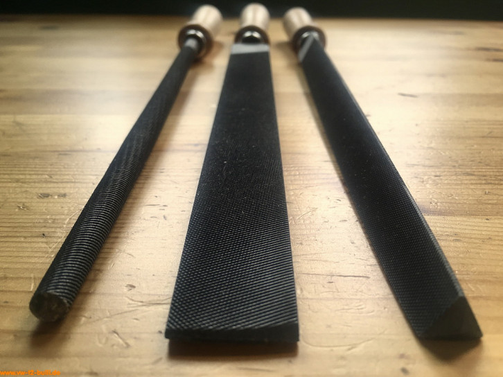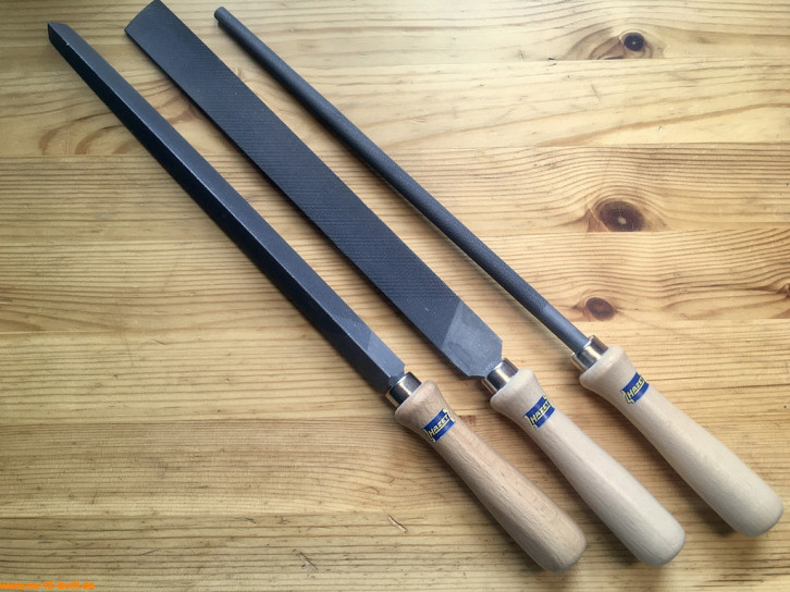Alte, brauchbare Originale habe ich bisher nicht finden können - Feilen sind aber auch Verbrauchsmaterial. Daher hier nur von mir nachgestellte Versionen (zusammengebaut aus je 250 mm Feilenblatt der Firma FORTIS und No-Name 110 mm Holzgriff, Holzgriff lackiert und mit selbstgemachtem Wasserschieber-Logo verziert).