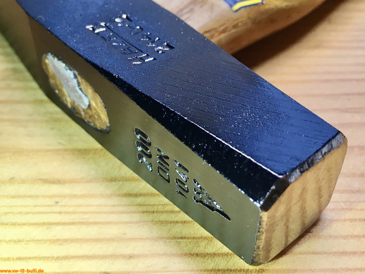 Dieser 280 mm lange und 200 g schwere Schlosserhammer mit Holzgriff aus Hickory (sehr hartes, belastbares und haltbares Holz aus Walnussgewächs) war Teil der Werkstattausrüstung für luftgekühlte VWs.