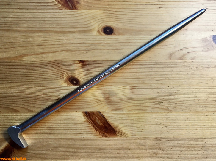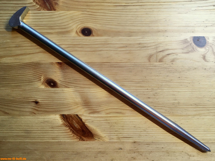 Dieser 400 mm lange Hebeleisen diente unter anderem zum Abziehen der Staubkappen an der Vorderachse. Aber auch zum Lösen festgerosteter Teile, Ein- und Austreiben von Lagern und Lagerschalen, Ein- und Ausbau der Federn, Bolzen, Zahnrädern. Es gehörte zur HAZET Werkstattausrüstung für luftgekühlte VWs.