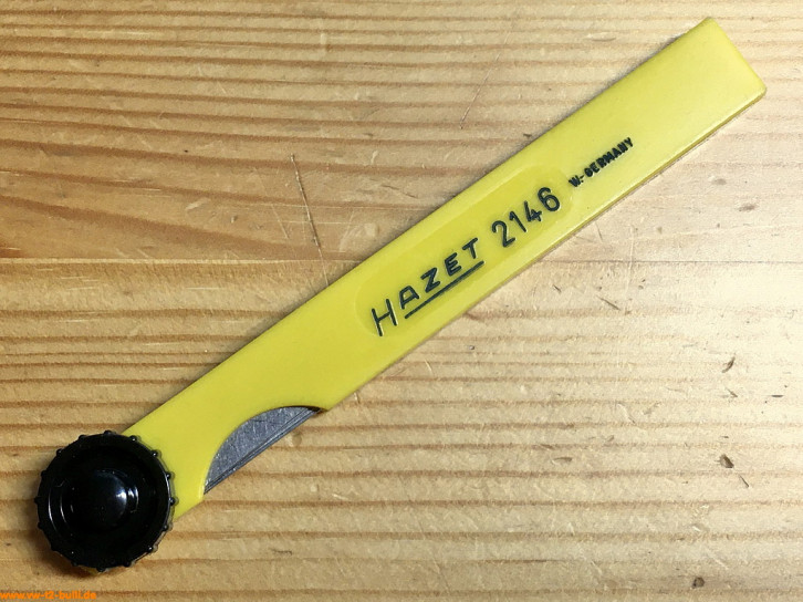 Aufschriften sind "HAZET 2146" und klein "W-GERMANY" auf dem Griff - und die Größen "0,10", "0,15", "0,20", "0,30", "0,40" und "0,60" auf den Fühlerlehrenblätter.