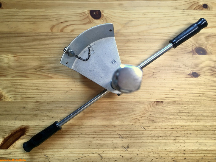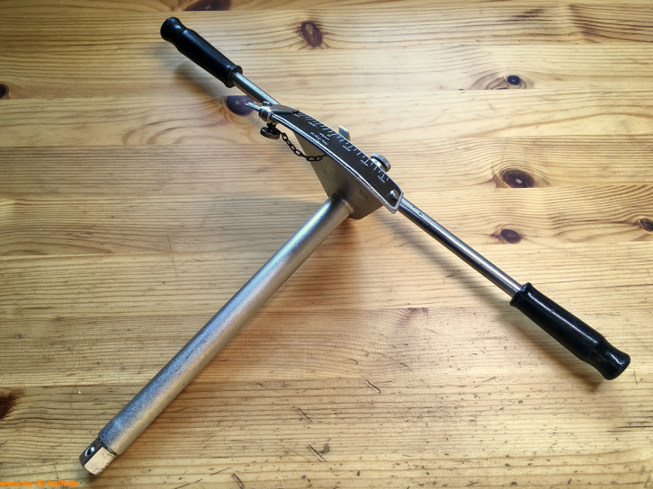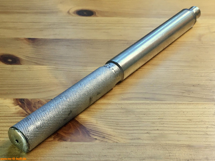 Dieser 270 mm lange Drehmomentschlüssel für 1/2" Steckschlüssel-Einsätze für maximal bis 6 mkg bzw. 6 mkp bzw. knapp 60 Nm diente zum Anziehen verschiedener Verschraubung an VWs. So laut Katalog 1958 mit 8 mm Inbus-Einsatz zum Anziehen der Lagerschrauben der Pleuelstangen (5 mkg), mit 10 mm Inbus bzw. 15 mm "2565" zum Anziehen der Zylinderkopfmuttern (3 mkg), mit 14 mm zum Anziehen der hinteren Gehäusemuttern (2 mkg) oder der Lagerschrauben der Pleuelstangen (5 mkg), mit 17 mm zum Anziehen der vorderen Muttern des Motorgehäuses (3 mkg). Für den zu nutzenden Wert hat das Werkzeug einen verschiebbaren und arretierbaren Merkerzeiger an einer Kette (Zeiger fehlt hier noch in den Bildern). Er entspricht dem Volkswagen-Sonderwerkzeug "VW 118".