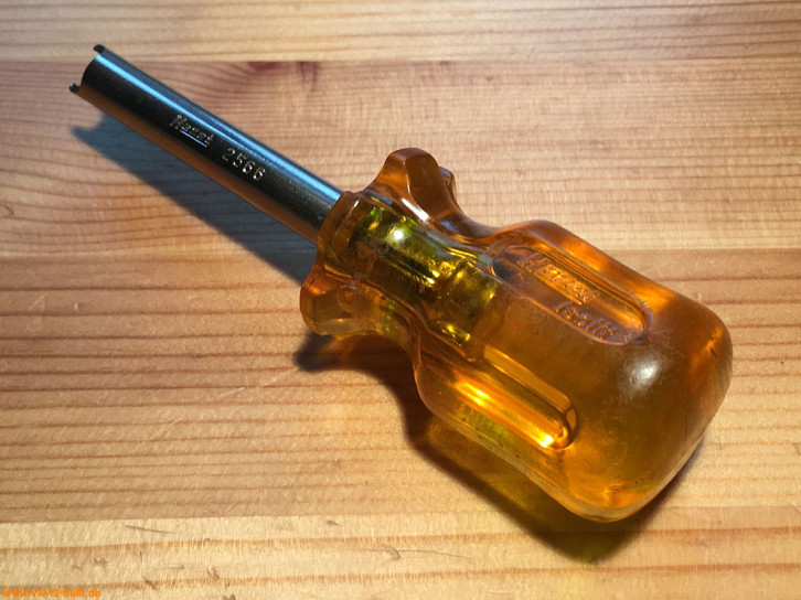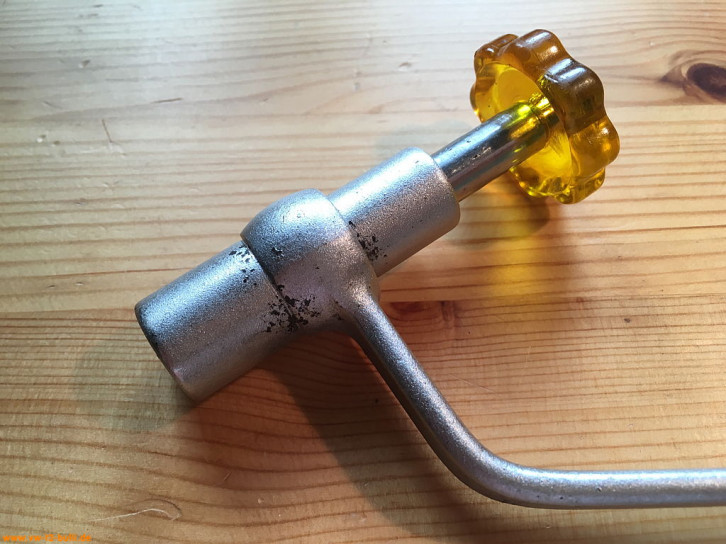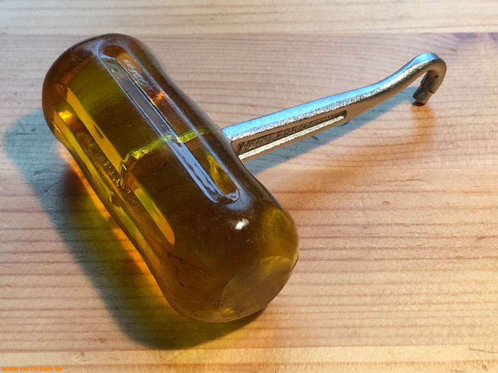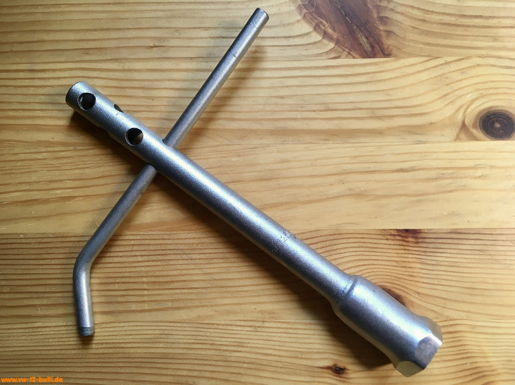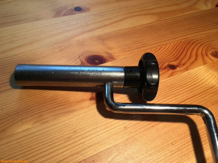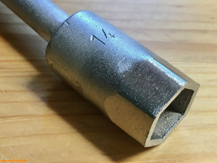 Ein mit einer Länge von 135 mm einfacher Zündkerzenschlüssel für 20,5 mm mit 150 mm langem Stecker (wahrscheinlich nicht der Originale). Für einen Typ 4 Motor eher zu kurz und fummelig. Als kompaktes Bordwerkzeug für einen Typ 1 Motor vielleicht noch ok.