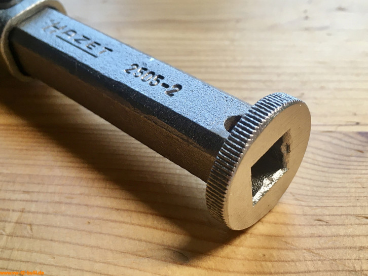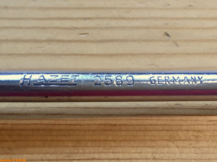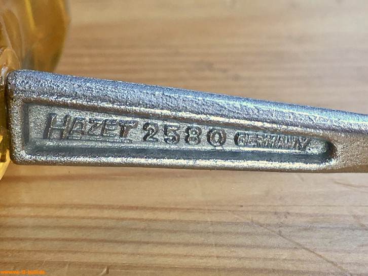 Aufschriften sind "HAZET 2580 GERMANY" und "CHROM-VANADIUM". Auf dem Griff gibt es dagegen keine Aufschrift mehr.