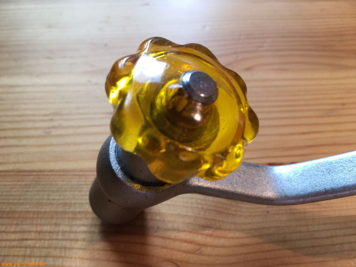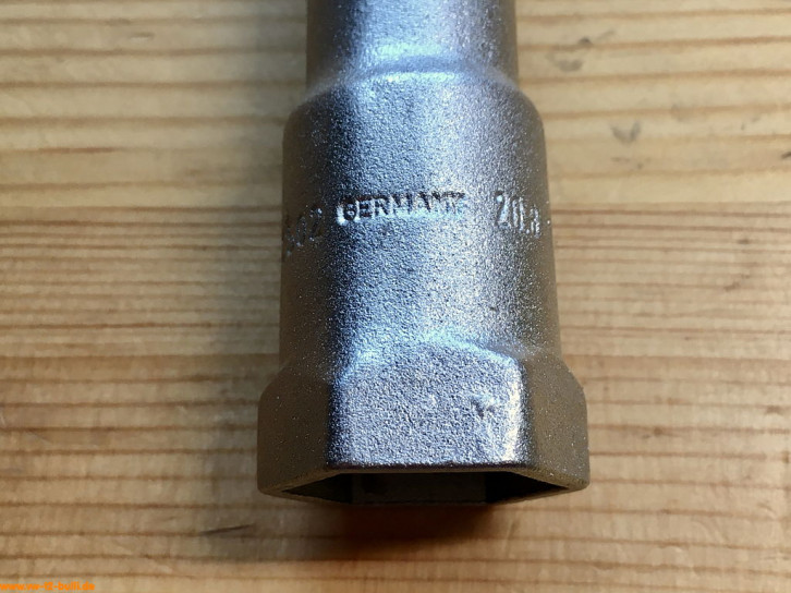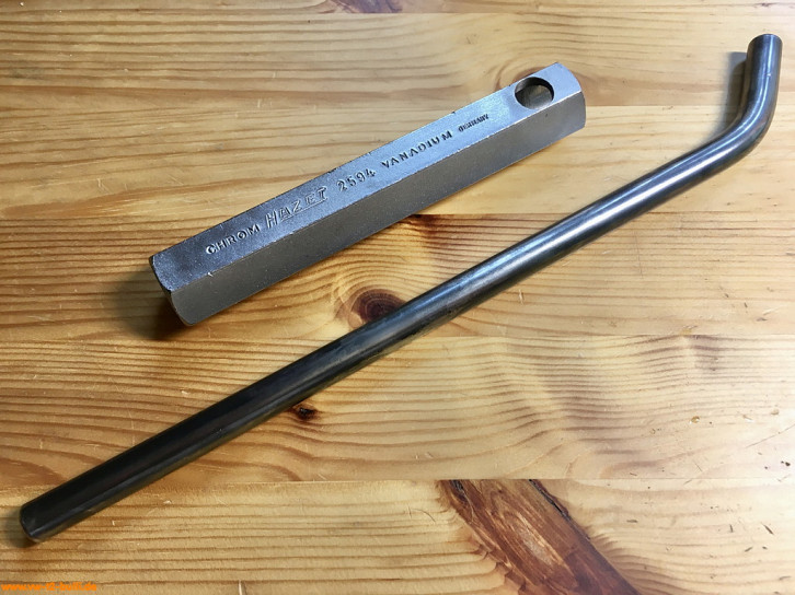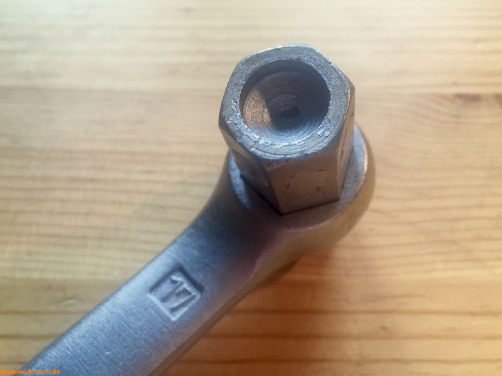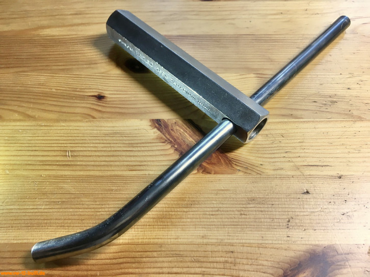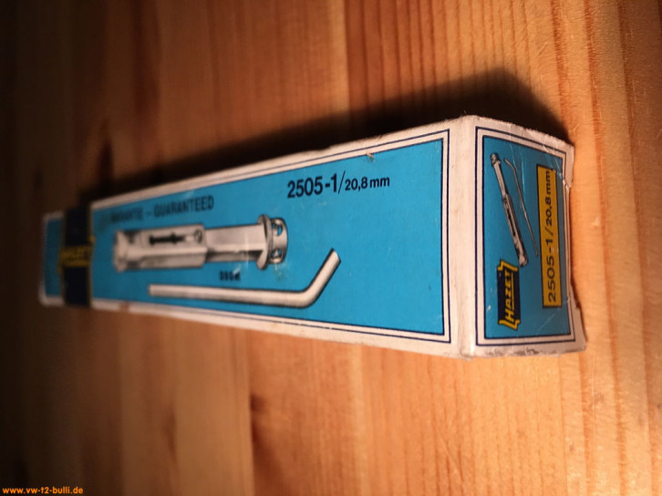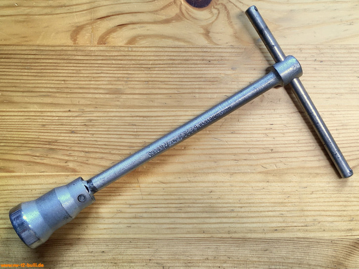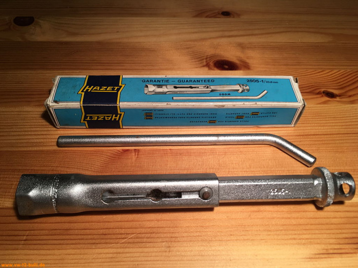 Ein mit einer Länge von 128 mm einfacher Zündkerzenschlüssel für 20,8 mm mit 190 mm langem, abgewinkeltem Stecker. Für einen Typ 4 Motor eher zu kurz und fummelig. Als kompaktes Bordwerkzeug für einen Typ 1 Motor vielleicht noch ok.
