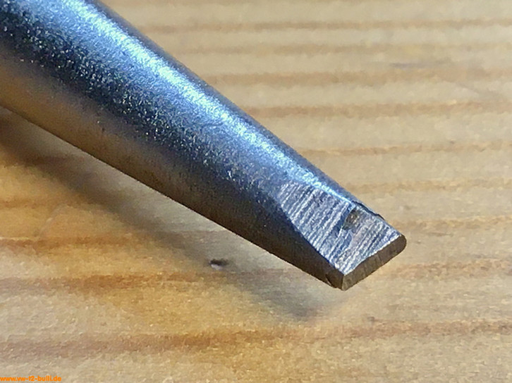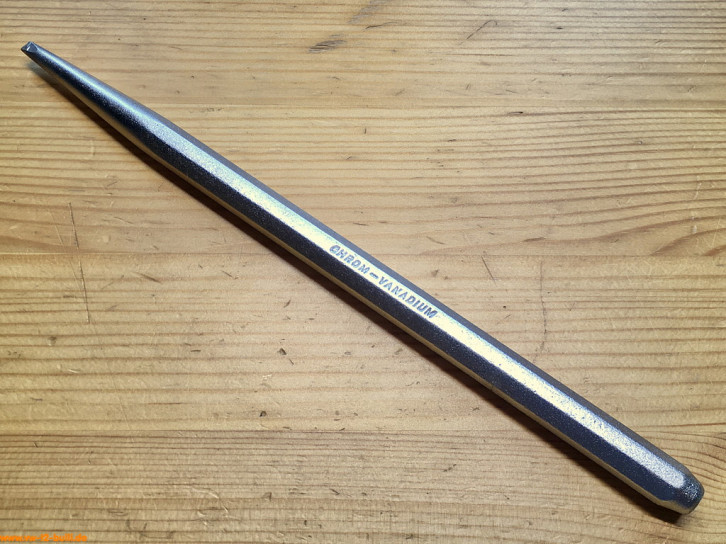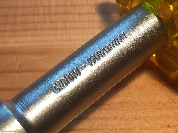 Diese 200 mm lange Kerbstemmer dient zum Sichern der Pleuellagerschrauben des Motors VW Typ 1, 2, 3 und 4 - und der Spezialmutter der Hebelbolzen der Kupplung VW Typ 1 und 2. Er entspricht dem Volkswagen-Sonderwerkzeug "VW 124".