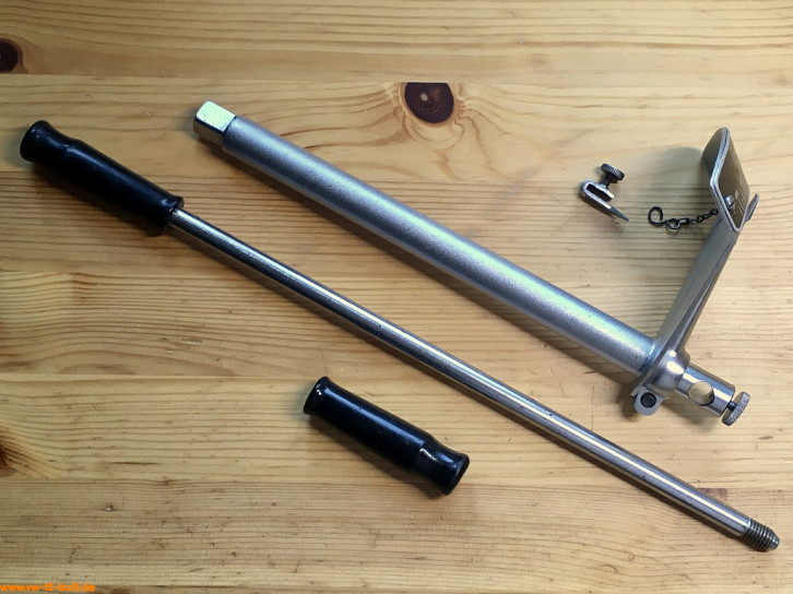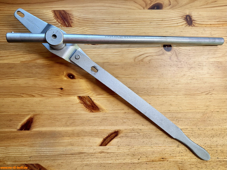 Diese 460 mm lange und x mm dicke Hebelverlängerung für die Führungsplatte "2511" ist Teil des 4-teiligen Sets 2510 für Schwungscheibe und Hinterachse bei Typ 1, 2 und 3. So für die Hohlschraube des Schwungrades, für Hinterachsmuttern und für die Spezialmutter für das Gebläserad bei alter Motor-Ausführung von Typ 1 und 2.