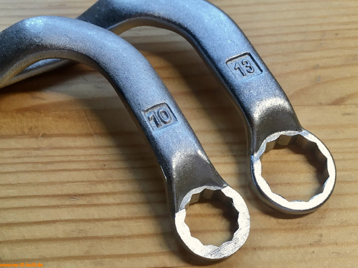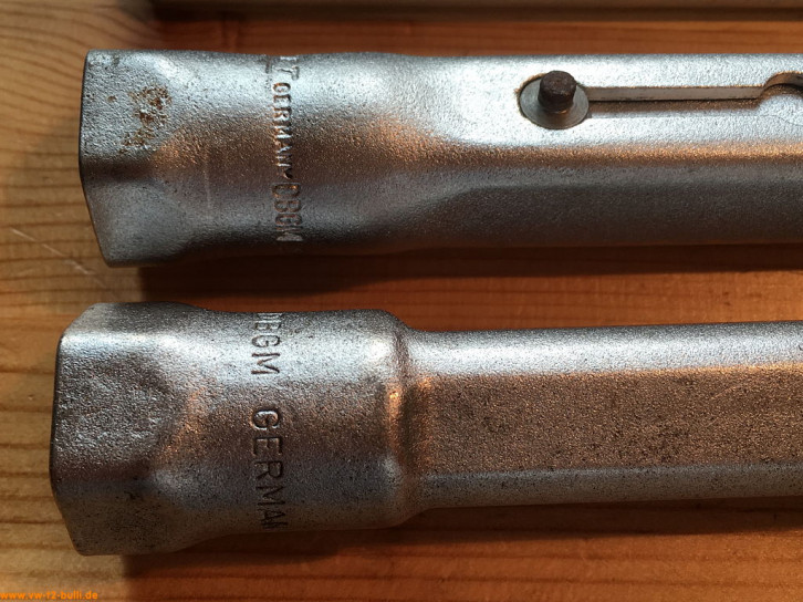 Der gebogene 205 mm lange Spezialschlüssel mit 10 mm Schlüsseln diente zum Nachziehen der Befestigungsmuttern des Ölpumpendeckels bis August 1967. Der andere mit 13 mm Schlüsseln diente zum Nachziehen der Befestigungsmuttern des Ölpumpendeckels ab August 1967.